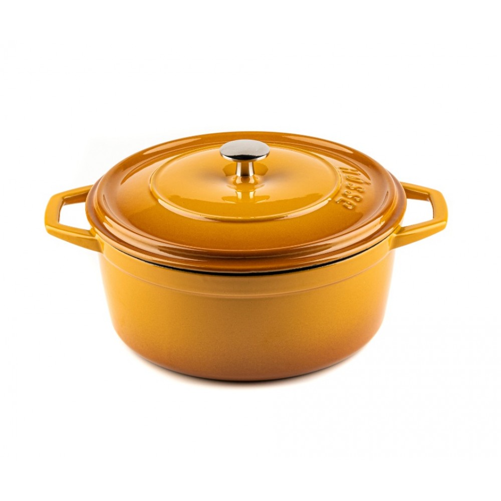 Una olla universal de hierro fundido con revestimiento esmaltado y un diseño moderno que hace lucir bien cualquier estufa.